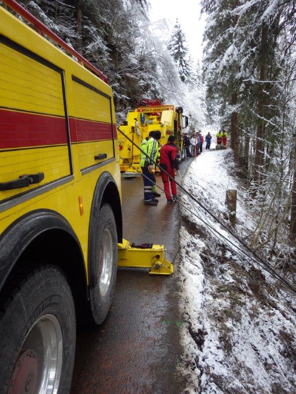 Im dichten Schneetreiben ist ein zweiachsiger und 18 Tonnen schwerer Schneepflug in einem Waldstück abgerutscht. Bedingt durch engen Strassenverhältnisse und das relativ hohe Gewicht des zu bergenden Fahrzeuges wurden unsere beiden vierachsigen Bergefahrzeugen mit zwei 95m/t Kranen eingesetzt.